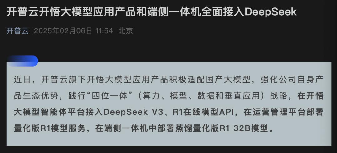開(kāi)普云則宣布在開(kāi)悟大模型智能體平臺(tái)接入DeepSeek V3、R1在線模型API,在運(yùn)營(yíng)管理平臺(tái)部署量化版R1模型服務(wù),在端側(cè)一體機(jī)中部署蒸餾量化版R1 32B模型。